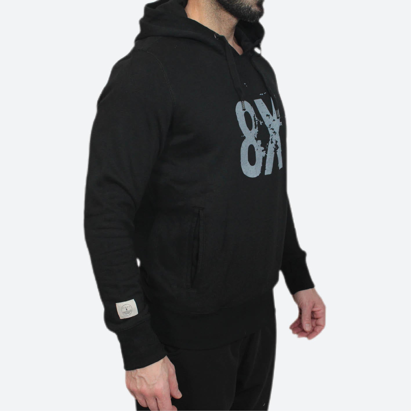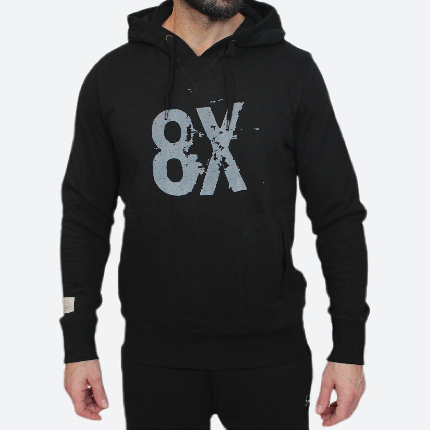 8X signature logo unisex hoodie in an ultra-soft organic combed cotton and polyester blend, featuring a gray screen-printed logo, finished with an 8X label sewn in left sleeve above the cuff.
