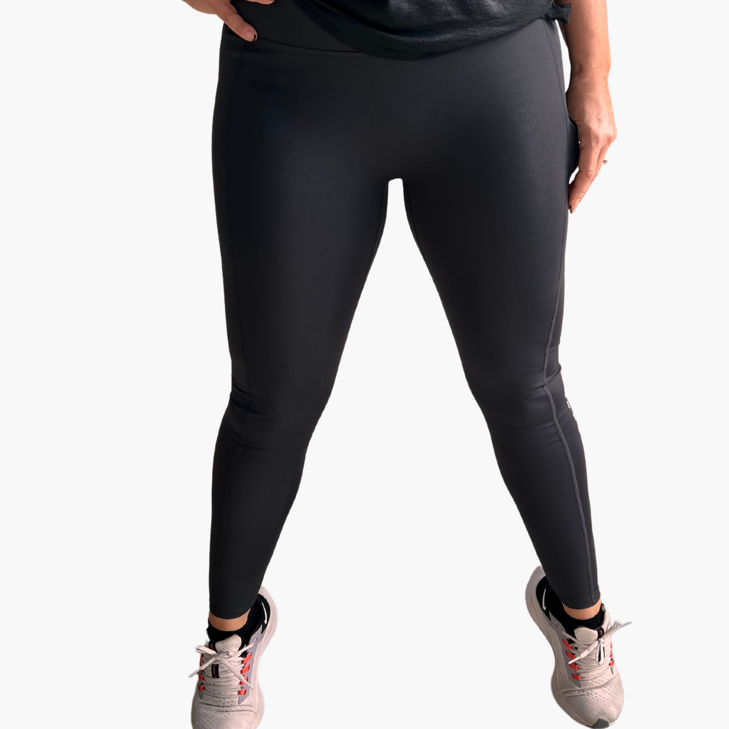 A full-length, high-rise legging with “Down Once More” graphic on left leg. Left thigh pocket. Light compression.