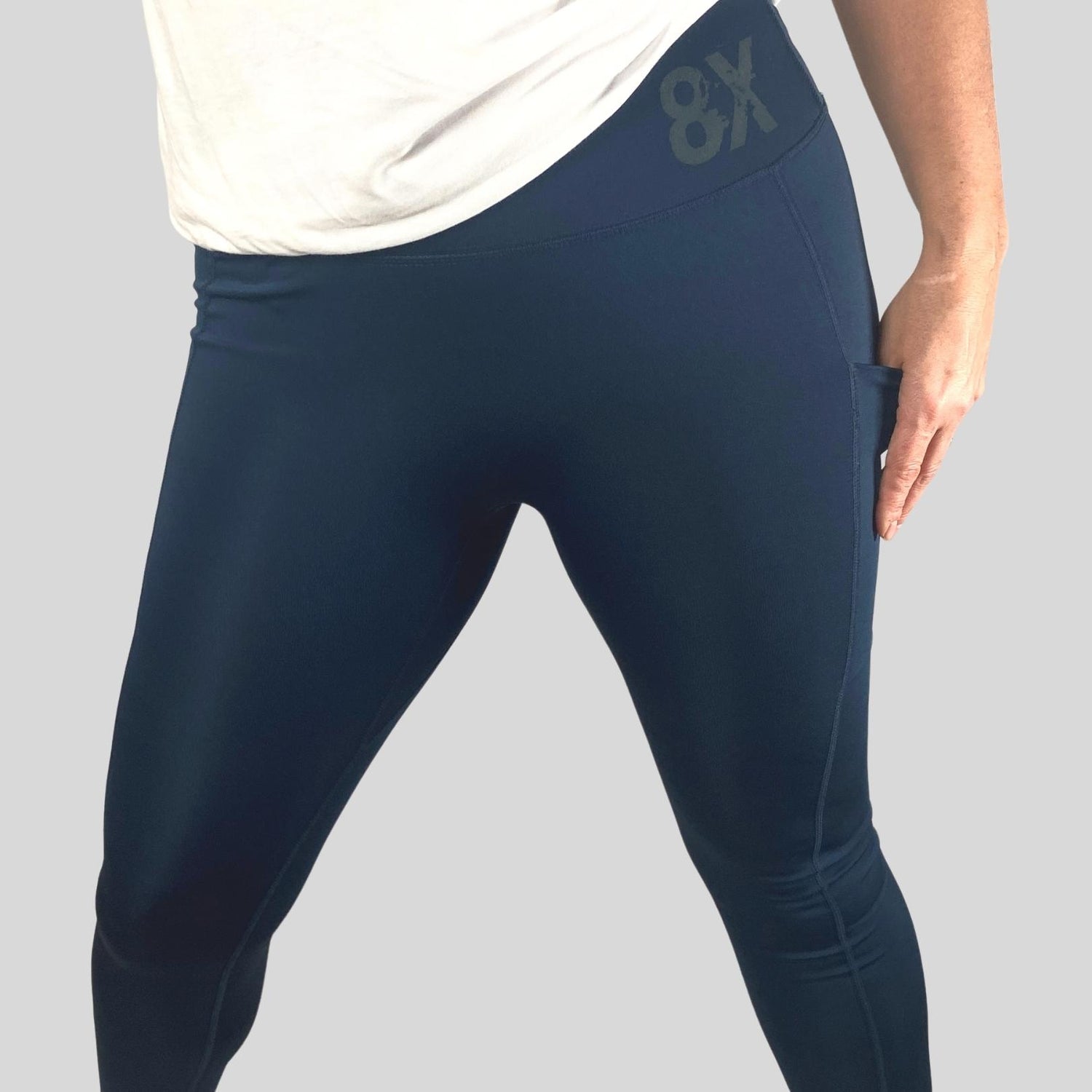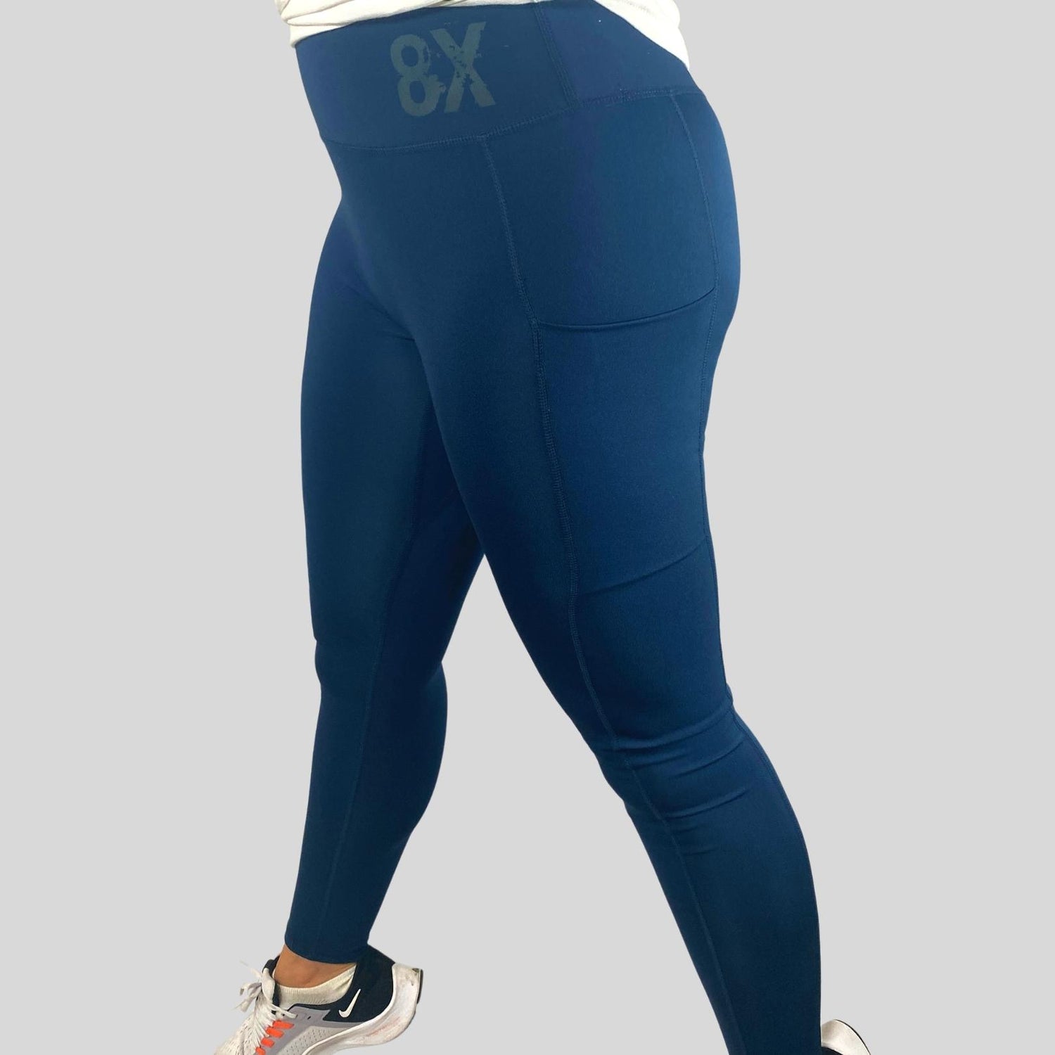 A full-length, high-rise legging with “8x” graphic. Left thigh pocket. Light compression.